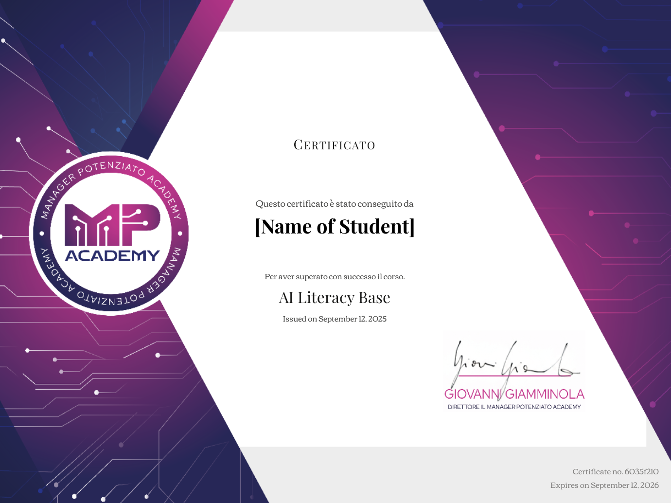 La Manager Potenziato Academy è la scuola di pensiero dove manager, leader e professionisti imparano a guidare l’Intelligenza Artificiale — non semplicemente a usarla — per trasformare i processi aziendali con visione, metodo e impatto reale.